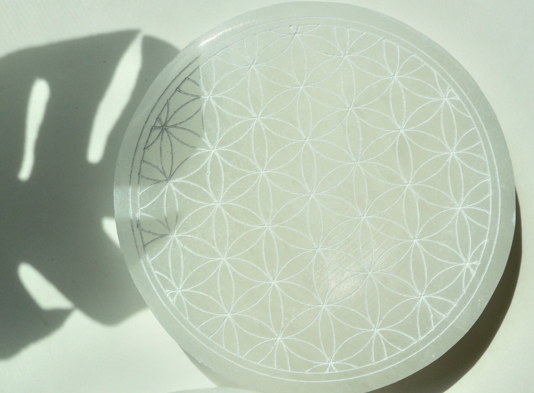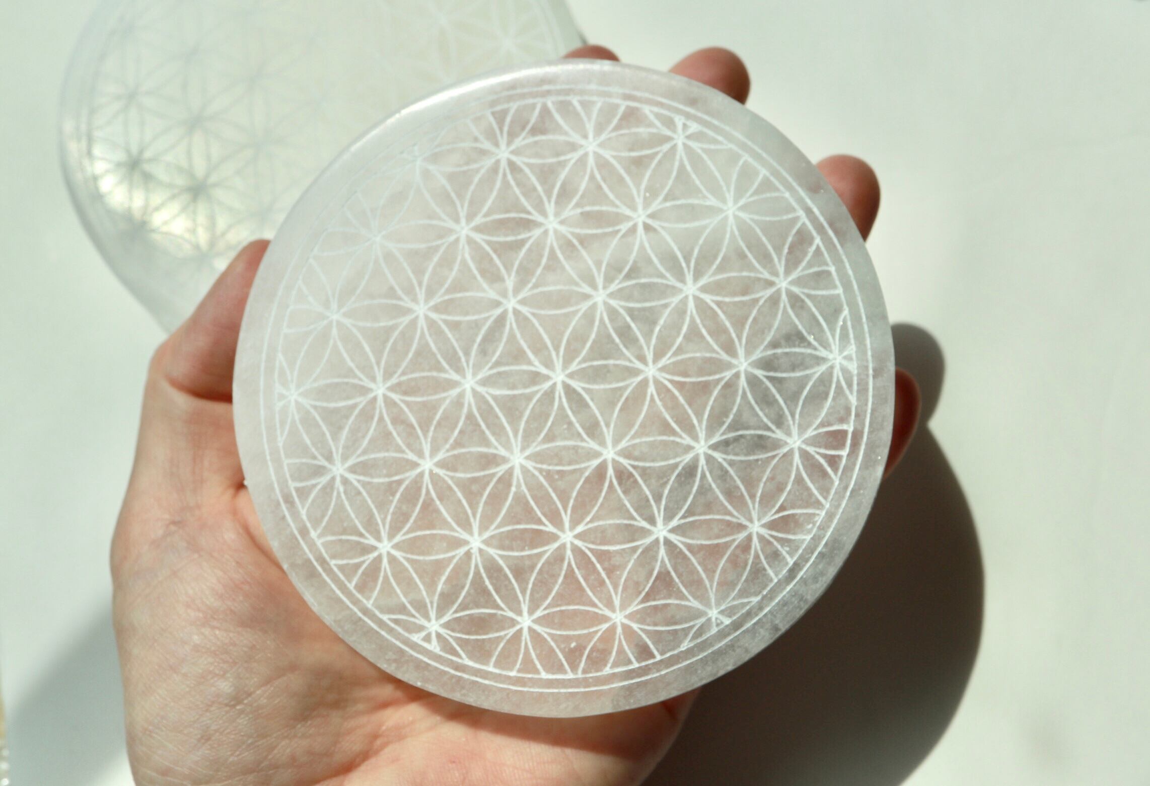 モロッコ産のセレナイトにフラワーデザインのカットをほどこした丸プレート。